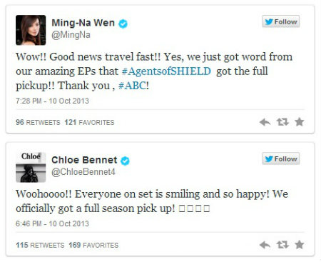 As atrizes Ming-Na Wen (Melinda May) e Chloe Bennet (Skye) de imediato partilharam, via twitter, a sua alegria face a esta notícia.