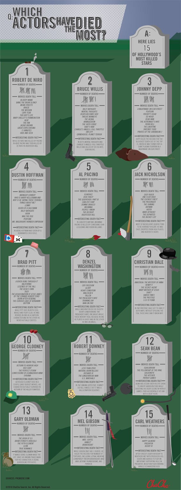 No entanto, um traço comum a várias destas performances é que muitos dos personagens acabam por… morrer, e porque morrer também faz parte do trabalho, o Chacha.com elaborou um elucidativo infográfico que expõe quem são os atores que mais morreram ao longo das suas carreiras.