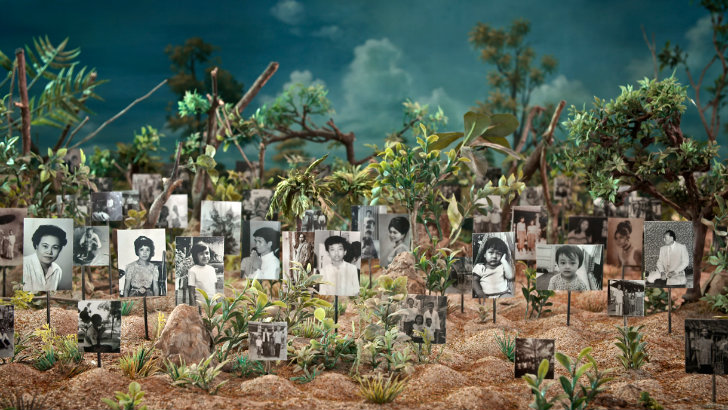 Caras aparecem sobrepostas a árvores com os troncos cortados e a sangrar resina. Aldeias em miniatura tomam o lugar de cidades e vilas que o Khmer Vermelho fez sumir sem deixar rasto. As fotos da família de Panh aparecem no chão, na terra, entre ramos e em dioramas, como espectros a observar os tormentos do presente. Não temos aqui nenhum gesto estilístico tão exuberante como o uso das figuras de barro em “A imagem Que Falta”, mas sim uma extensão do discurso material de todo o filme. Na banda-sonora, uma voz narra em francês e verbaliza aquilo que as imagens artesanais do cineasta não conseguem.
