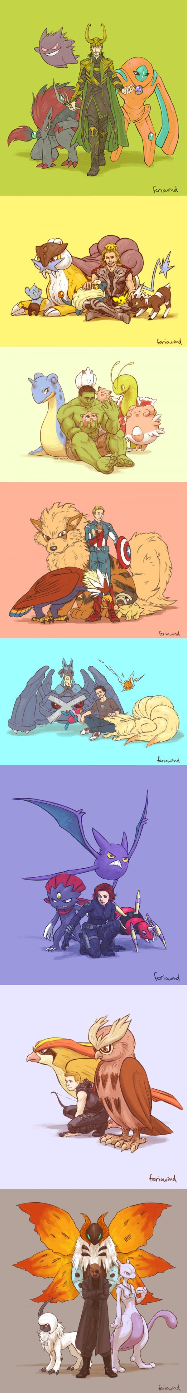 Já que estamos numa onda de Pokémons (veja AQUI do que falamos), apresentamos abaixo (via FerioWind) uma criativa galeria de imagens que imagina os Vingadores (bem, alguns não são Vingadores, mas façamos de conta que são) com Pokémons como animais de estimação.