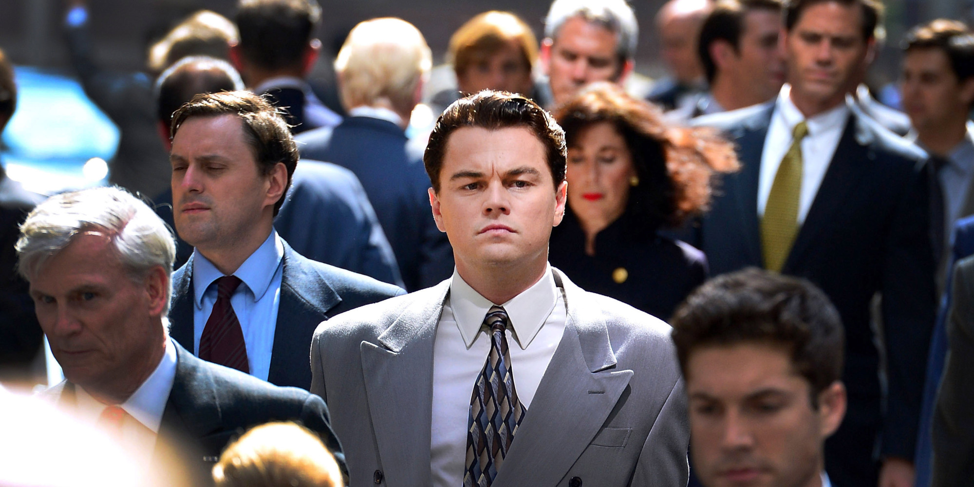 Como Jordan Belfort (Leonardo DiCaprio), que chega a corretor com um fato cinzento, de aspeto barato, camisa branca e gravata de padrão geométrico, num estilo que colide fortemente com as peças azul-marinhas às riscas, casaco elegantemente trespassado, lapelas grandes e gravata vermelha do carismático Matthew McConaughey.