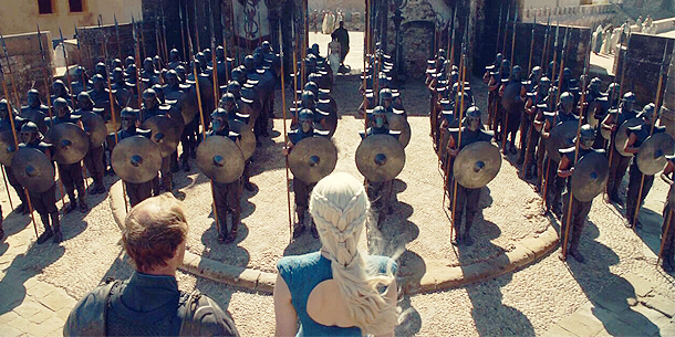 A parte final do episódio pertence ao arco da Daenerys e que cena espectacular que foi. Somos apresentados ao exército dos Unsullied (Imaculados), um exército com um treino e preparação tão duros que põem a um canto as provas e os costumes dos espartanos. Daenerys tem um dia para decidir se quer adquirir o exército ou não. Estou ansioso para ver o que vem a seguir. No final do arco, Daenerys é atacada por uma menina Warlock (mago), através de uma bola com um bicho parecido a um escorpião lá dentro. Esta cena foi colossal! O perigo vem de onde menos se espera e o poder dos Warlocks é intimidante, mas Daenerys é salva por nada mais, nada menos que… Barristan Selmy! O pintor que usa apenas vermelho… Sempre gostei desta descrição e mal posso esperar por ver este guerreiro em ação novamente!