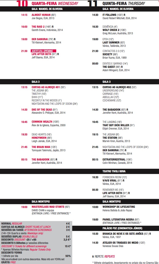 Life After Beth é o primeiro filme de Jeff Baena mas o norte-americano de 35 anos promete arrasar logo na estreia como realizador. Com Aubrey Plaza («Scott Pilgrim Contra o Mundo») como protagonista e nomes como John C. Reilly e Anna Kendrick no elenco, «Life After Beth» traz um olhar refrescante sobre o terror. E se o festival arranca no dia 10 de setembro com esta divertida comédia romântica zombie, também o encerramento garante uma boa dose de diversão. Meat Loaf é a grande estrela de «Stage Fright», a sessão de encerramento, num musical de Jerome Sable que quebra com os cânones do terror. Sangrento, sim; terrífico, sem dúvida, e cheio de boa música.