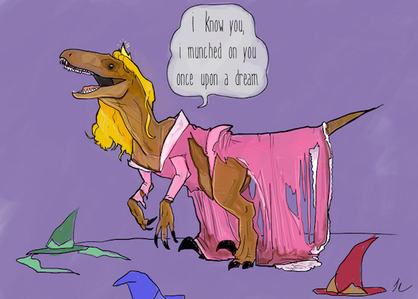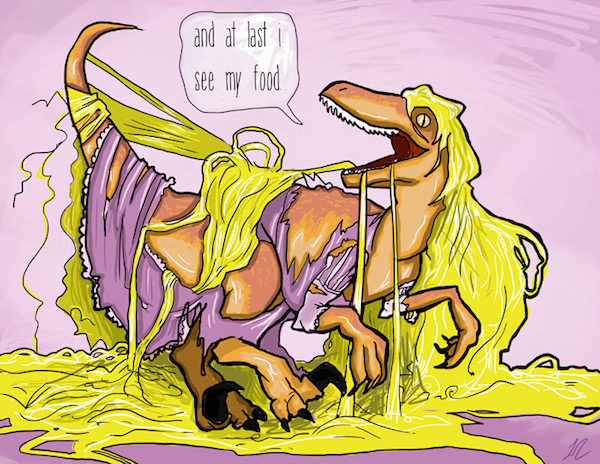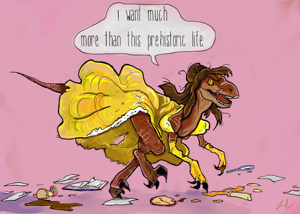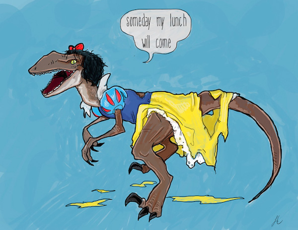 A artista Laura Cooper, da série de webcomics XP, decidiu levar a fundo esta ideia e cruzou as velociraptors de Mundo Jurássico com as princesas da Disney.