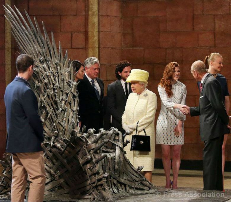 David Benioff e Dan Weiss, showrunners da série, fizeram uma visita guiada à rainha e ao seu marido, o Príncipe Phillip, pelo set de filmagens, adereços e guarda-roupa. Antes de sair dos estúdios, Isabel II conversou um pouco com alguns dos atores que particpam na série, como Maisie Williams (Arya Stark), Lena Headey (Cersei), Sophie Turner (Sansa) e Kit Harington (Jon Snow).