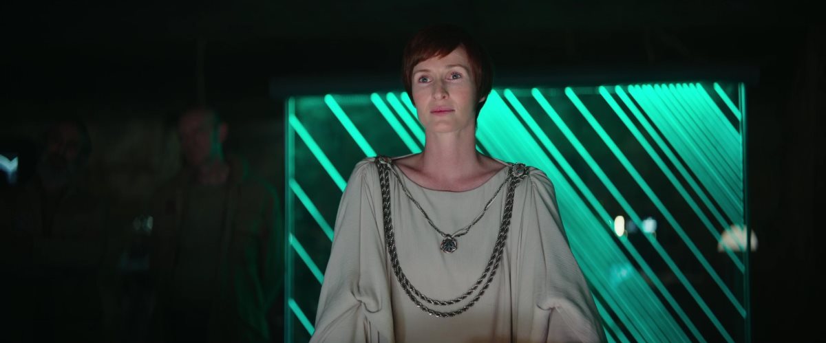 Mesmo assim, na escuridão, Mon Mothma consegue dominar visualmente a cena, e, para além do mais, as cores dos vários figurinos nunca são de uma intensidade particularmente chamativa ou dissonante. Até no caso de uma diplomata coberta em brilhantes drapeados doirados.