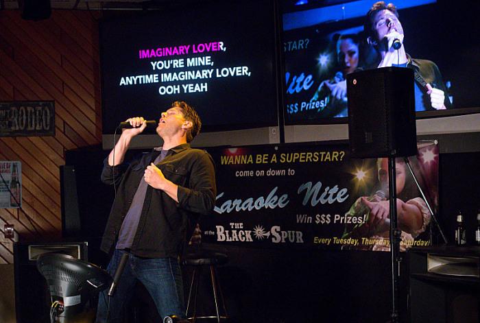 O Dean demónio diverte-se num momento de karaoke. Sabemos que o episódio musical de “Supernatural” será uma celebração dos 200 episódios, mas isso não significa que Dean não se antecipe e arrisque mostrar os seus dotes musicais. A foto divulgada pela CW mostra que Dean irá arriscar cantar um hit dos anos 70, “Imaginary Lover”, dos Atlanta Rhythm Section.